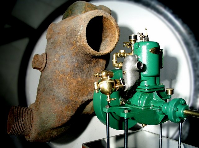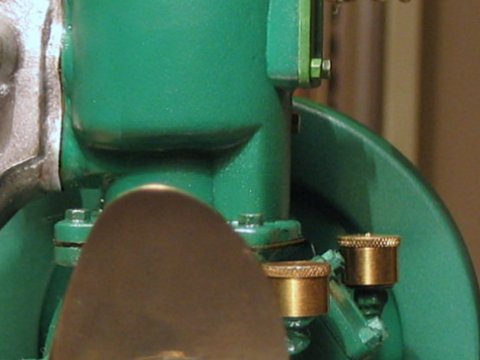 It is interesting to note that the cast iron "blob-shaped" manifold acts to handle both the intake of mixture from the carburetor and the exhaust output as well as being water cooled itself. I chose to make mine appear in the gray color of cast iron as the restored full size engine which I was copying had the manifold painted with high temperature silver paint. Some of the manifolds were painted the same green as the rest of the engine as hints of the original paint in the picture above would suggest.