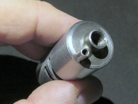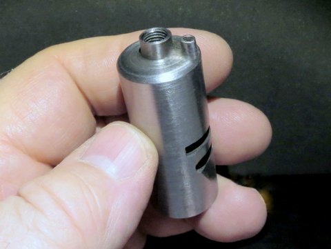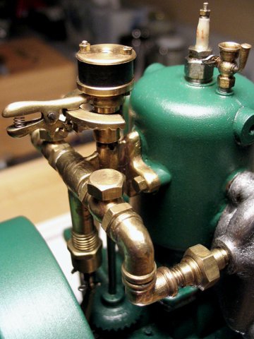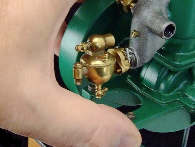 The Schebler employed a curved elbow air pipe inside to take advantage of the low pressure area which occurs in part of the bend. This creates enough vacuum to draw liquid fuel through a needle valve instead of using a straight restricted venturi as in modern carburetors. I copied the Schebler on the outside but omitted an internal float as it is unnecessary and impractical in such a small size. Gravity feed from a fuel tank located on a similar level is adequate. This is normal practice in model boats and airplanes which use internal combustion engines of this size.