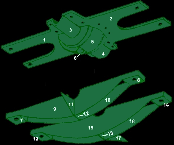 During construction in 1995 I made rough pencil sketches which show the major portions making up this single assembly. This H-shaped lower half of the crankcase is also visible in many of the photos. For inclusion on this page I added color to the sketches and also numbered the 18 individual steel pieces. These pieces were silver brazed together to create the lower crankcase.